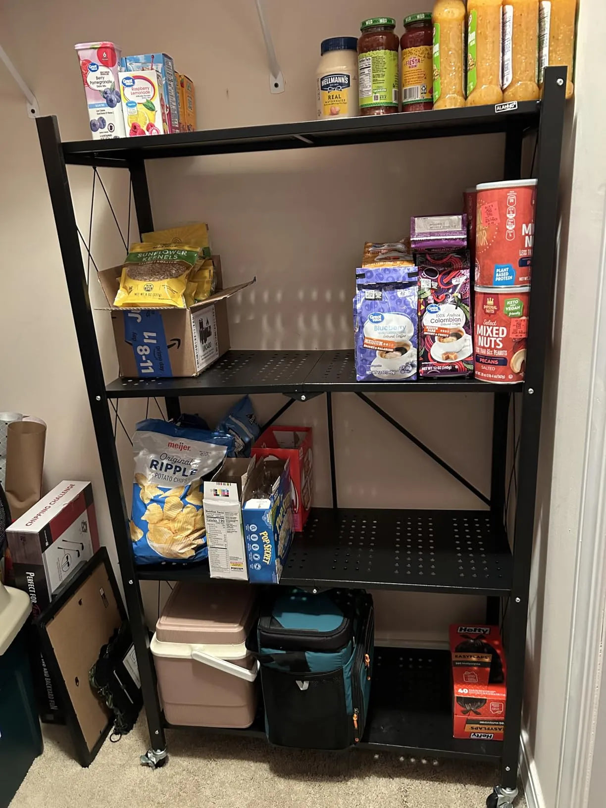 This shelf is really sturdy—holds heavy items like cans or small appliances without bending. It’s easy to assemble too and sets up in 10-15 mins. Spacious for garages, bedrooms, with adjustable shelves for tall items.